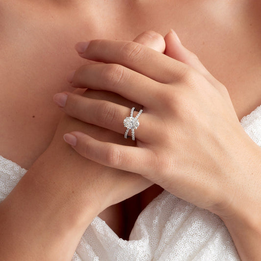 Oval Cut Hidden Halo 3 Side Pave Moissanite Diamond Engagement Ring