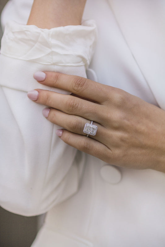 Radiant Cut Halo 3 Side Pave Moissanite Diamond Engagement Ring