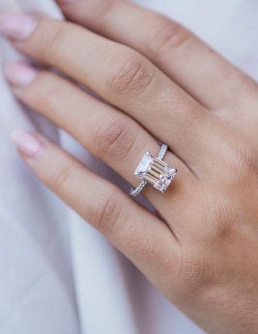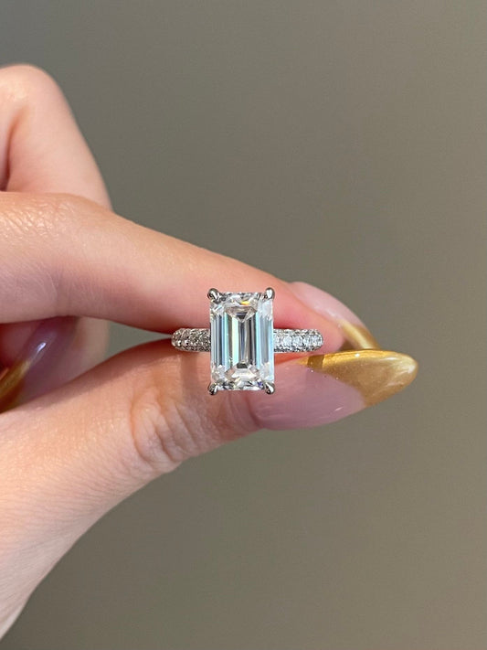 Emerald Cut Moissanite Hidden Halo Triple Pave Setting Engagement Ring